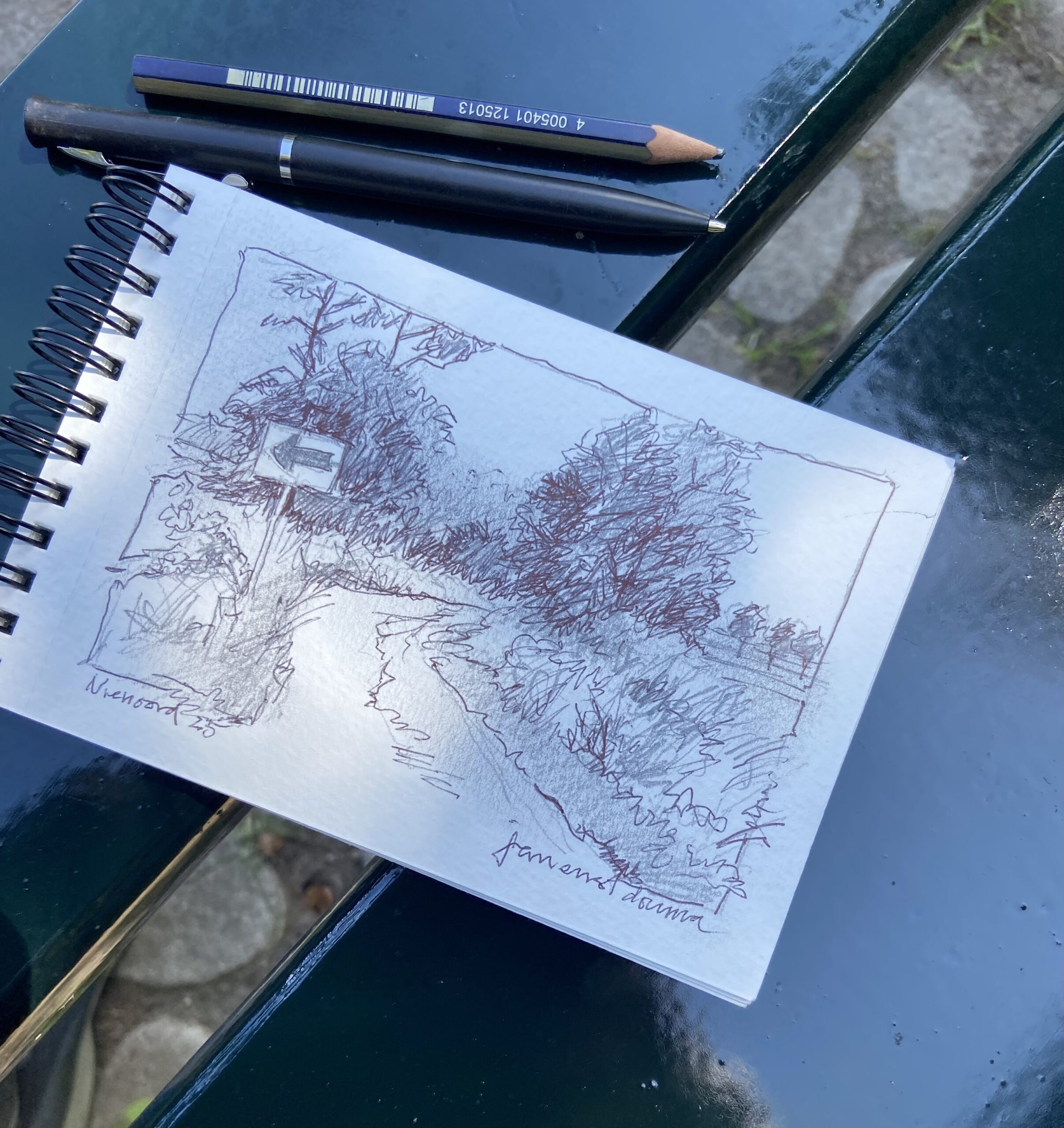 In het zomerseizoen is er, vaak op de fiets, een permanente kriebel om het waargenomen landschap beeldend “en plein air” vast te leggen. De oplossing bleek om in die vaak voorkomende gevallen een minitekenboekje, een zwarte balpen en een HB-potlood paraat te hebben.